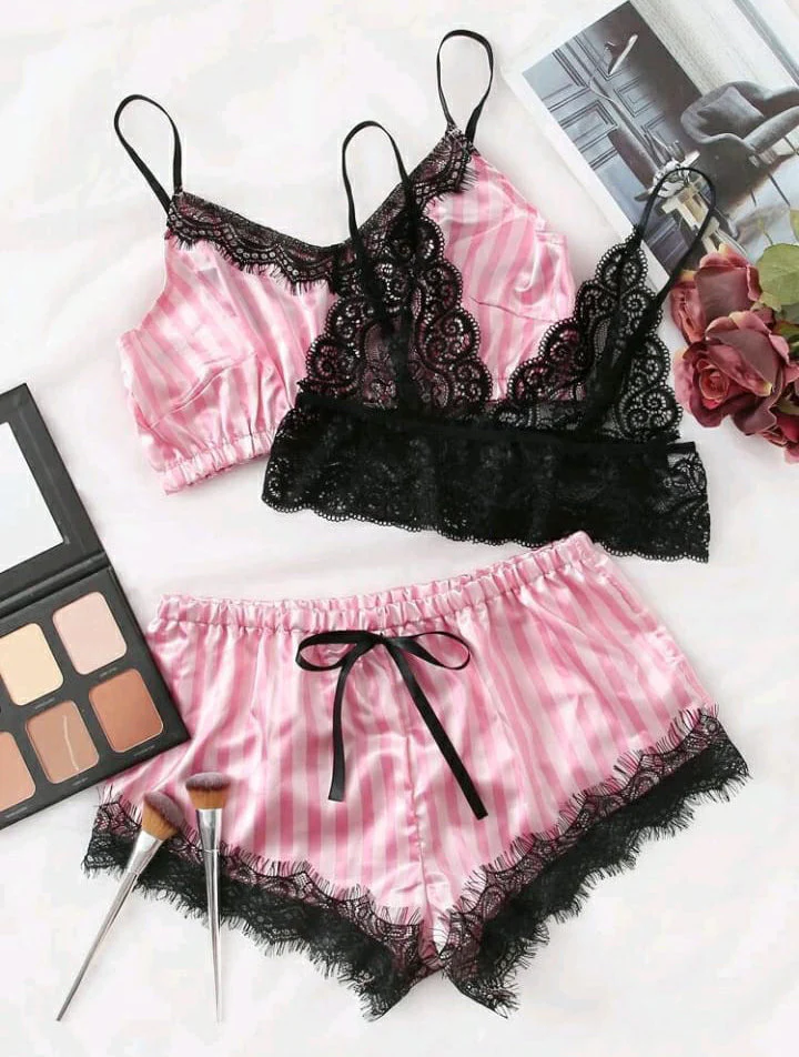 3 piezas, set de lencería de satén ribete con encaje de rayas.