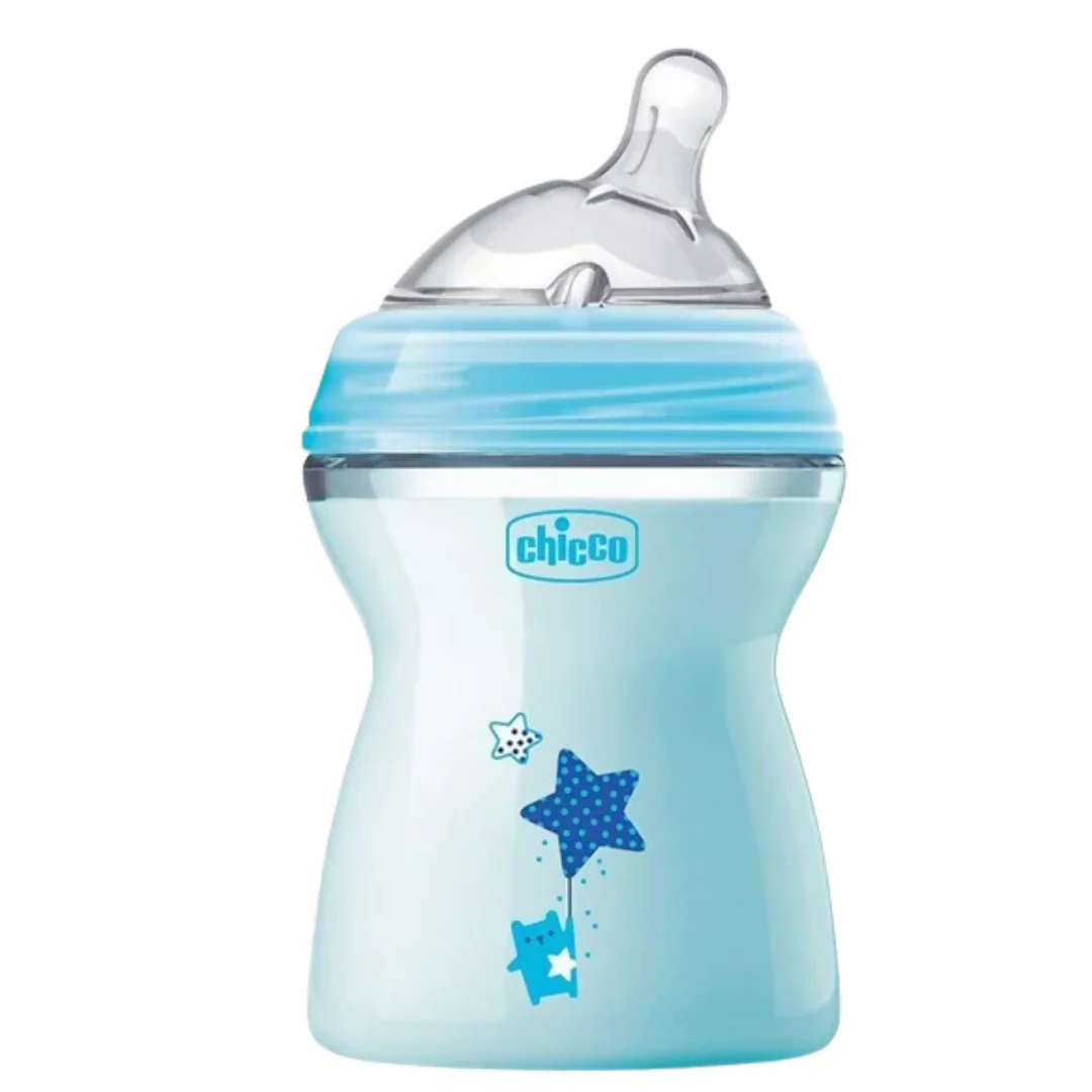 Biberón Natural Feeling marca Chicco 2m+, capacidad: 250ml / 9oz. Con tetina inclinada ideal para un agarre natural y una lactancia mixta. Aceptado por el 96% de los bebés. Con doble válvula anticólicos.