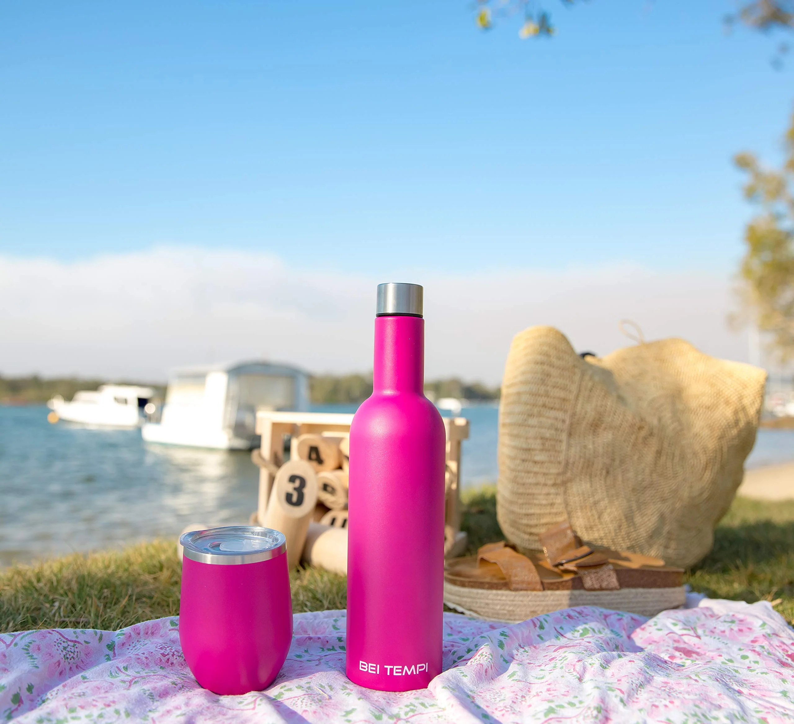 LLEVA TU BEBIDA A CUALQUIER LUGAR a cualquier evento con nuestro juego de termo de acero inoxidable aislado y botella de vino. El juego de vasos a prueba de sudor tiene un acabado mate con recubrimiento en polvo en tres colores vibrantes: rosa pavo real, verde lima y azul brillante. El diseño de doble pared y las tapas deslizantes a prueba de salpicaduras hacen que nuestro vaso de vino aislado con tapa sea ideal como copa de vino de viaje y portador de vino.