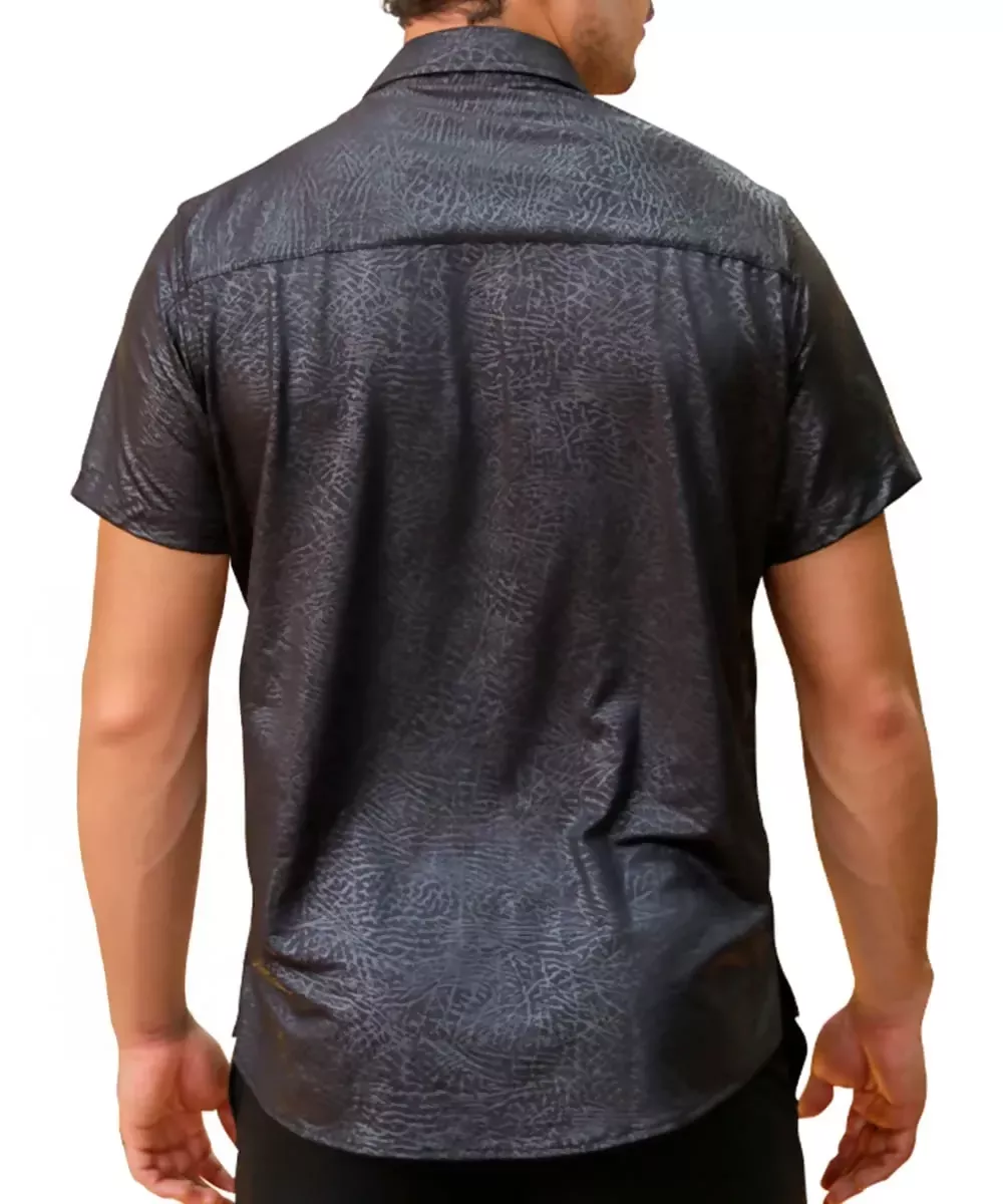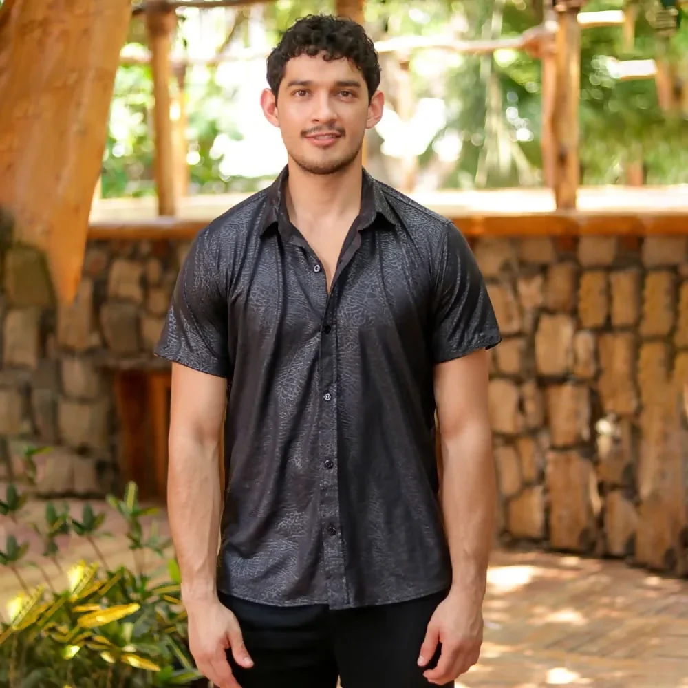 Camisa casual negra con textura para hombre destaca por su elegante acabado y diseño moderno. Fabricada en un material con sutil patrón de relieve, ofrece sofisticación y comodidad.