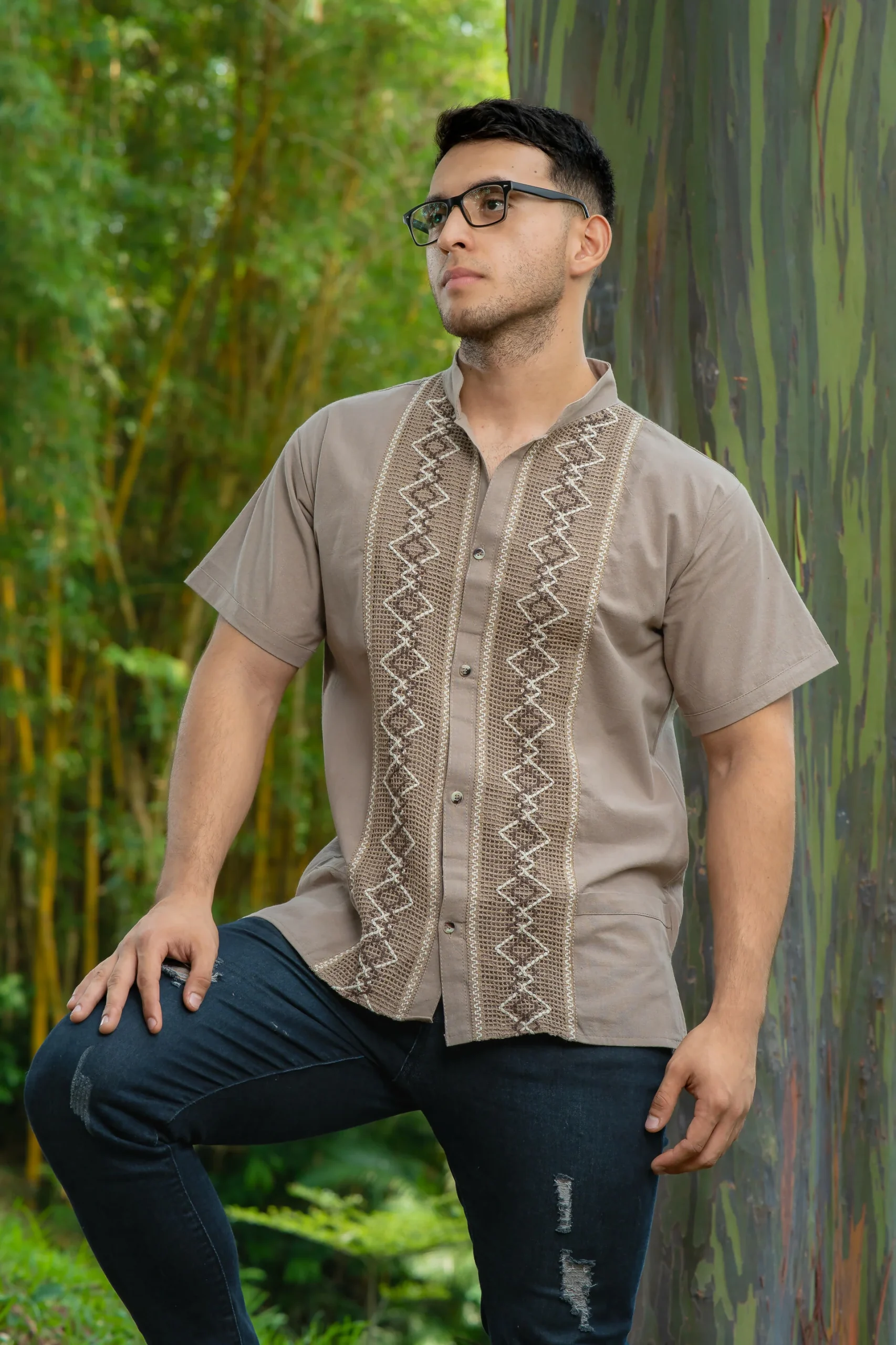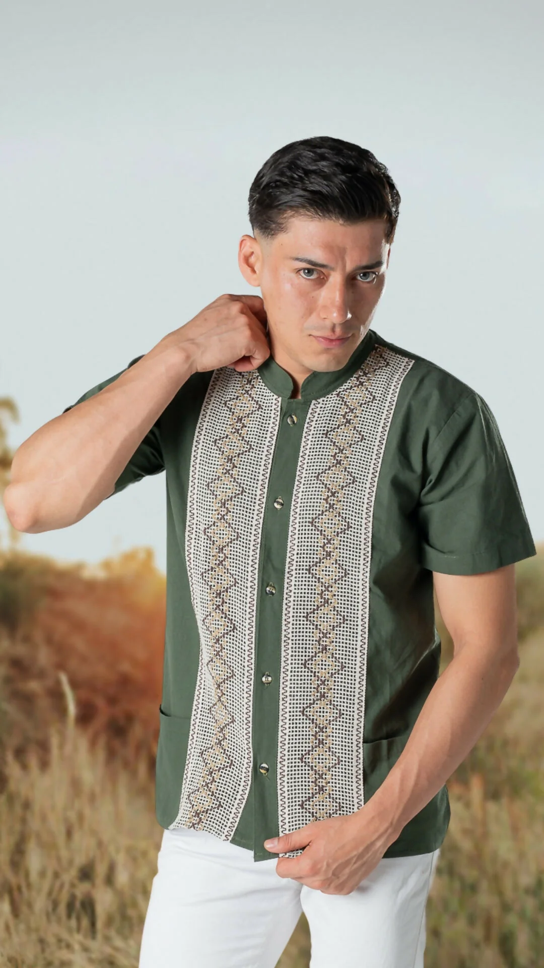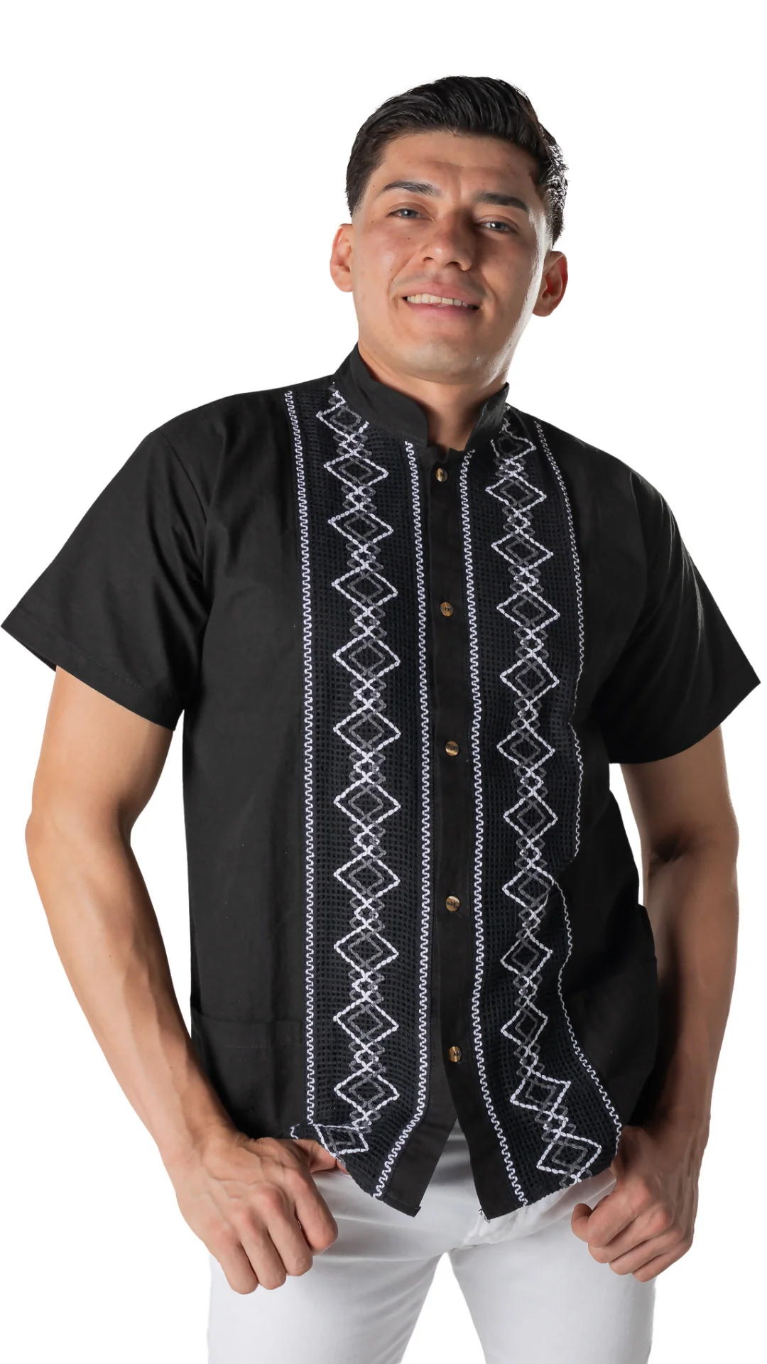 Elegante guayabera de manta con tejidos a mano en forma de rombos