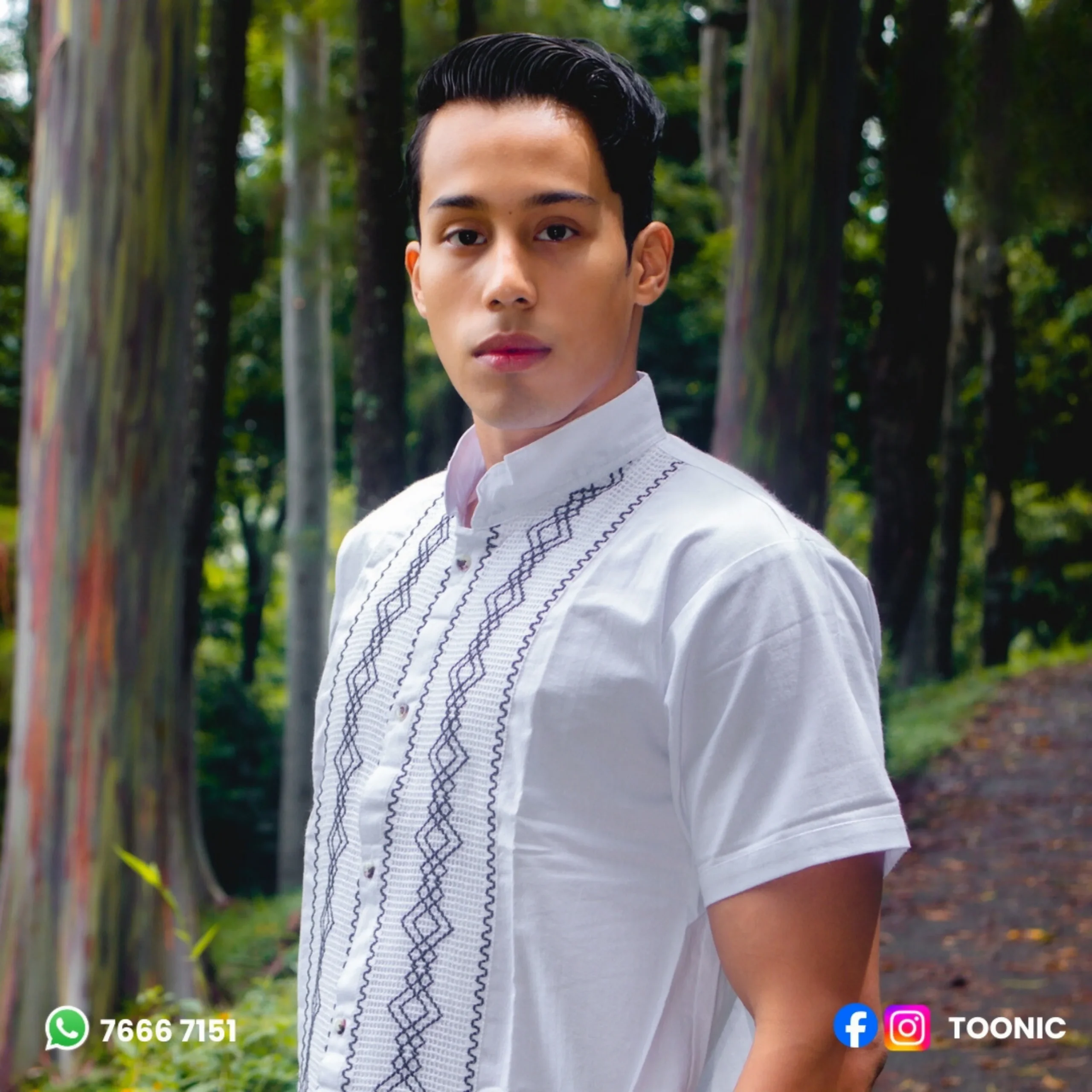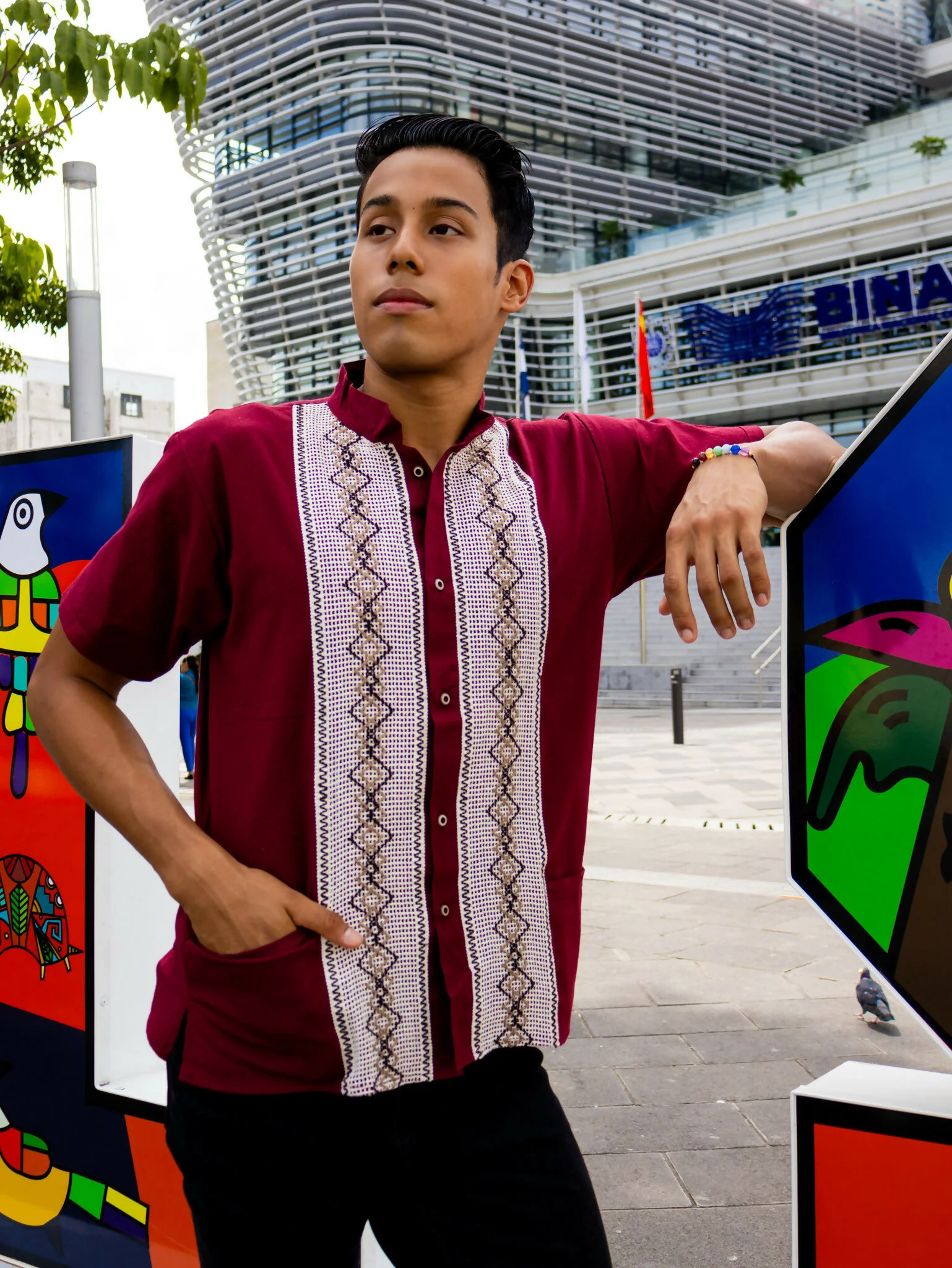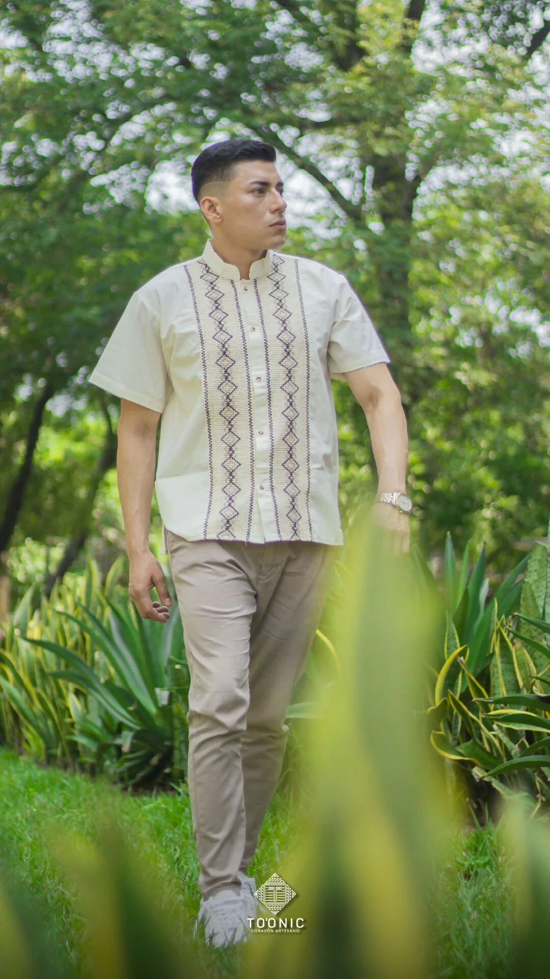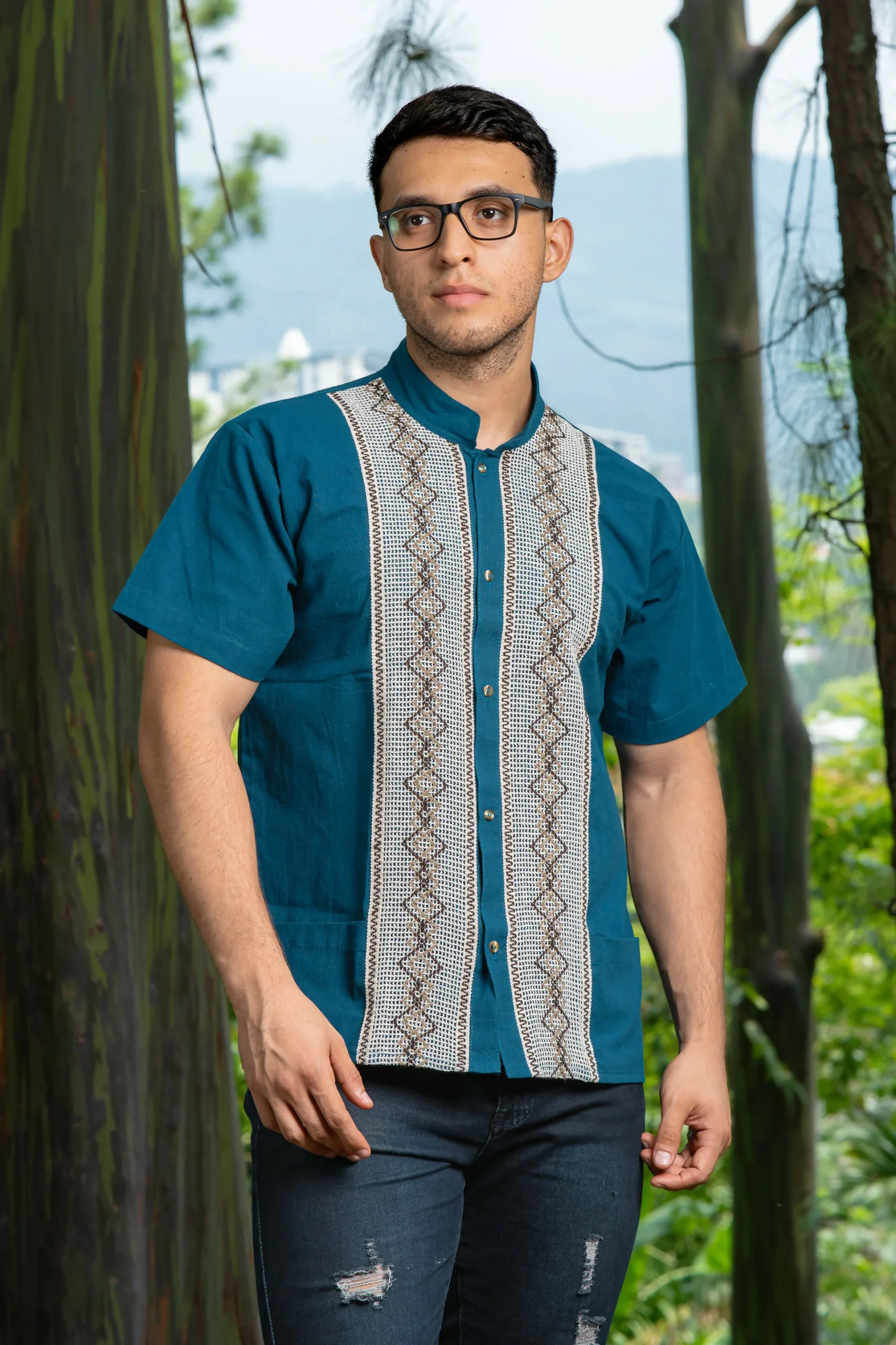 Elegante guayabera de manta con tejidos a mano en forma de rombos