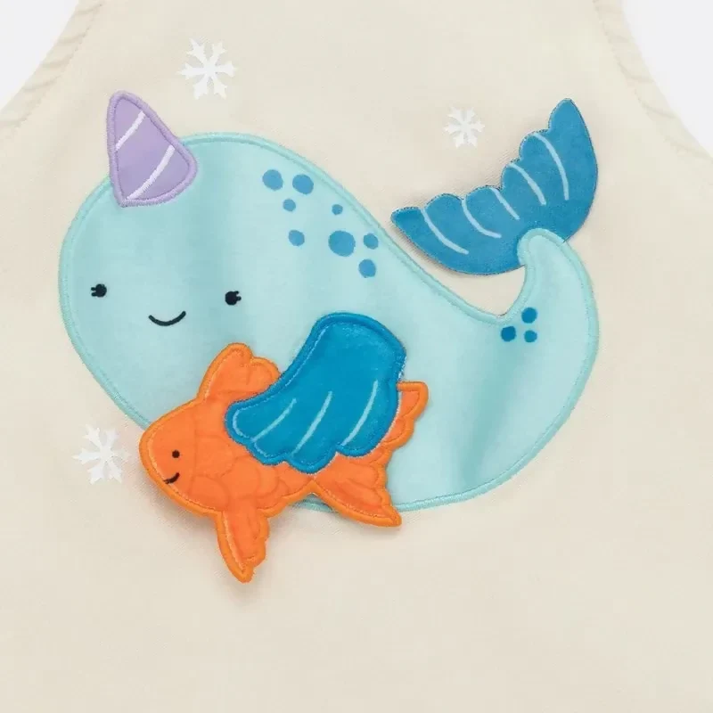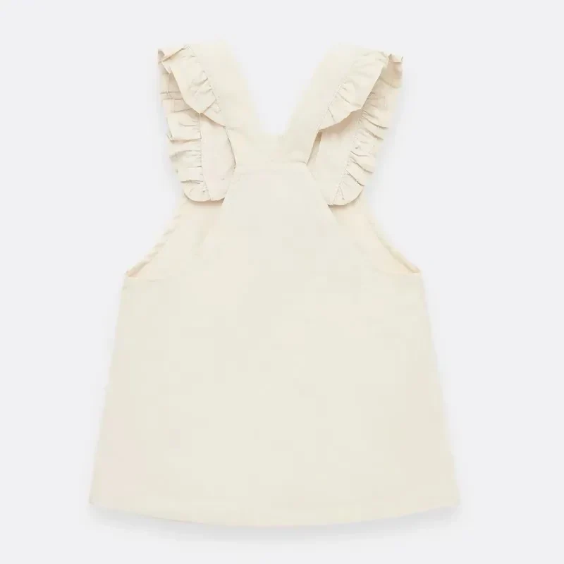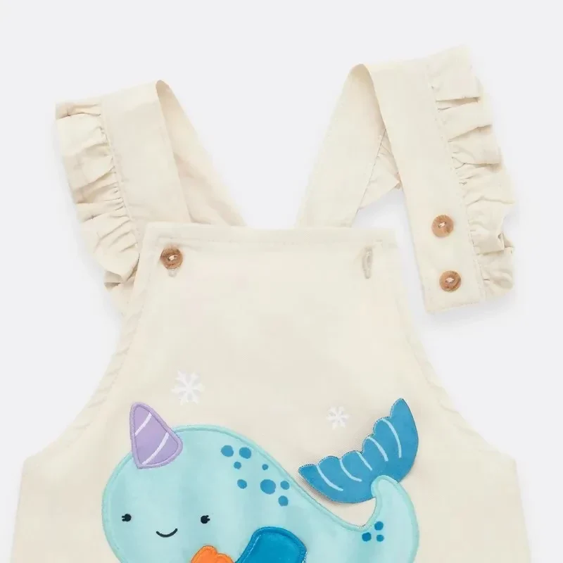 Precioso overol tipo vestido con tirantes ajustables, tela en algodón con aplique de tela con texturas para ayudar a la motricidad fina y el juego.
