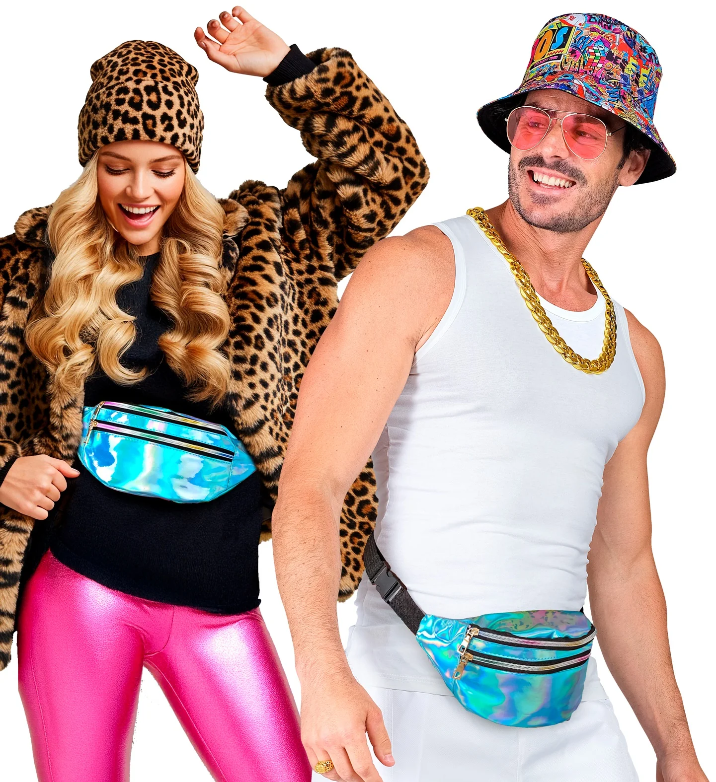 ¿Estás buscando una riñonera para tu disfraz ochentero? Con la riñonera holográfica estilo años 80 en color azul tendrás el complemento más original para disfrazarte como un chico o chica de los años 80 y triunfarás en tu fiesta de disfraces.
