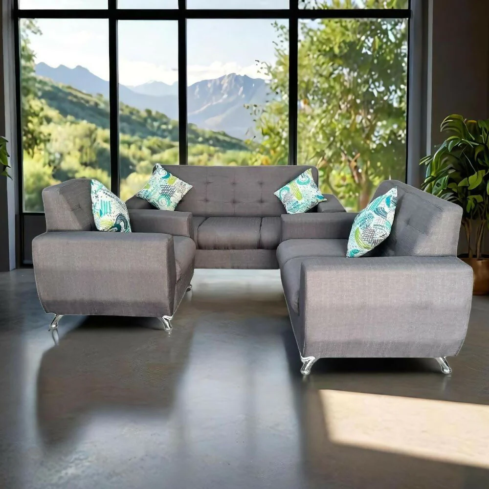 DISEÑO CON RESPALDO REFORZADO CON FIBRA PARA MAYOR COMODIDAD, PATA METÁLICA CROMADA LA SOSTIENEN. CONSTA DE TRES UNIDADES UN SOFÁ DE TRES ASIENTOS, UN SILLÓN DOBLE Y UNO INDIVIDUAL, PAQUETE DE 4 COJINES INCLUIDOS.