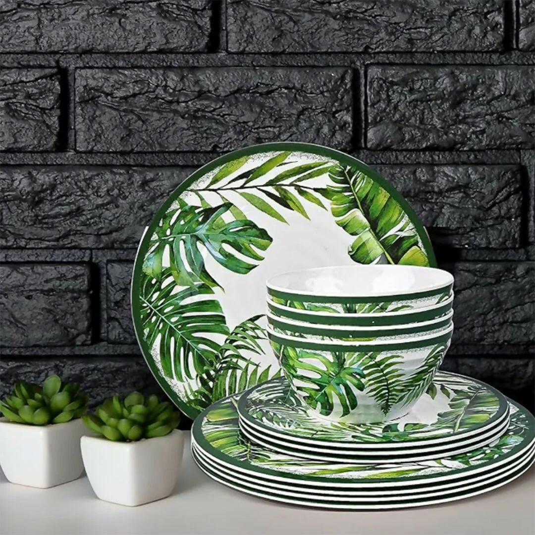 Elegante vajilla con detalles tropicales para 4 personas. Añade un toque de frescura y color a tu mesa.