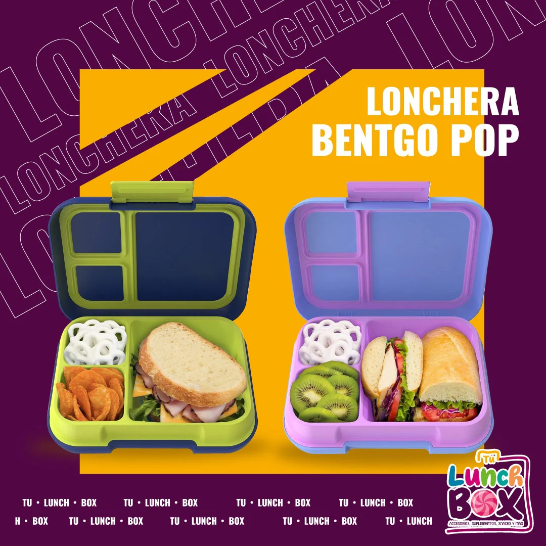 Bentgo Pop depósito a prueba de fugas con divisor extraíble.Equilibrio integrado: En porciones para caber un plato principal o un sándwich completo en el compartimento principal.