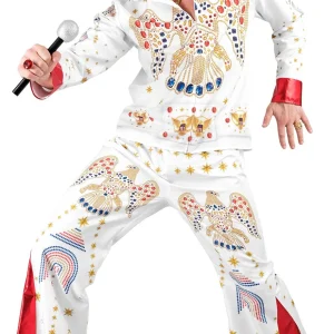 ¿Estás buscando un disfraz de Elvis para tu hijo? Con el disfraz de Elvis Presley infantil en color blanco tendrás el traje perfecto para disfrazar a tu hijo como este mítico cantante americano apodado «El Rey del Rock» y triunfará en su fiesta de disfraces.