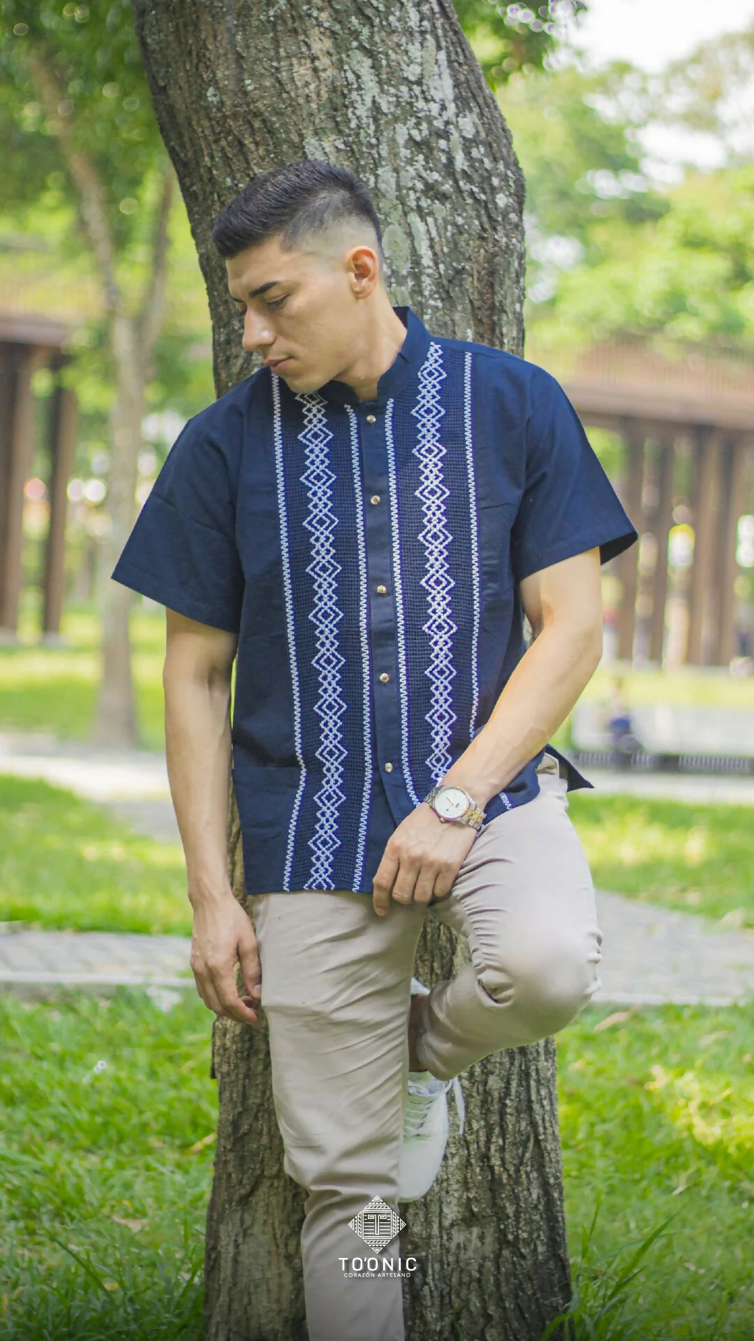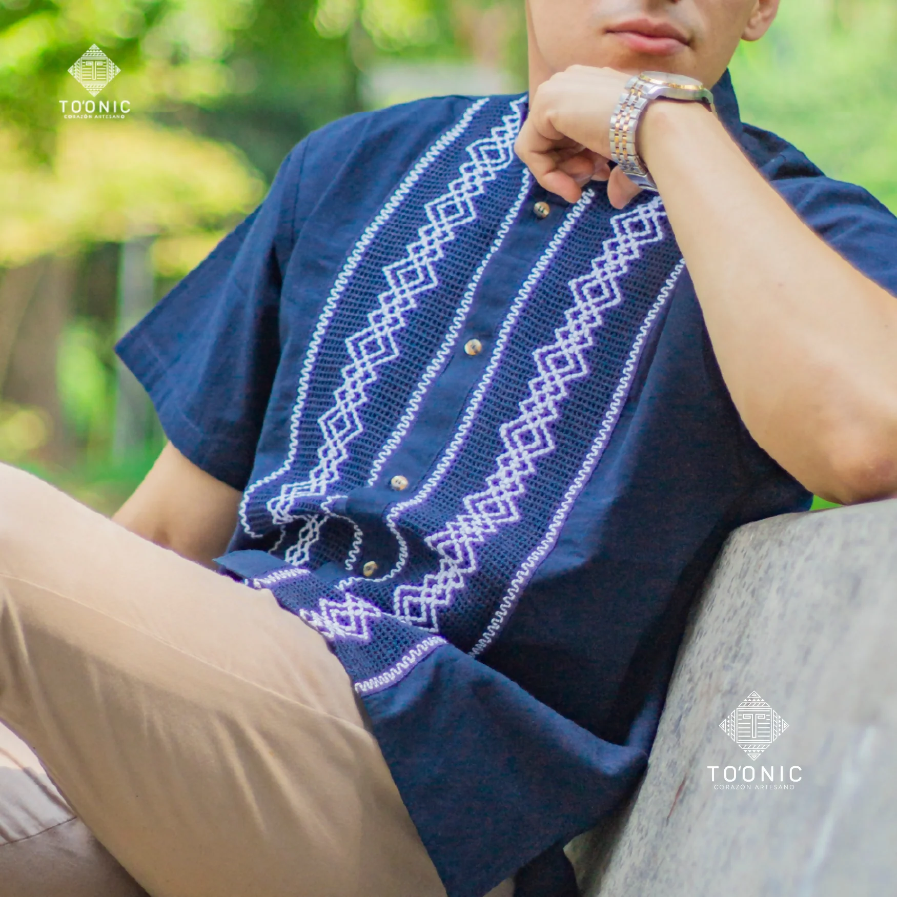 Elegante guayabera de manta con tejidos a mano en forma de rombos