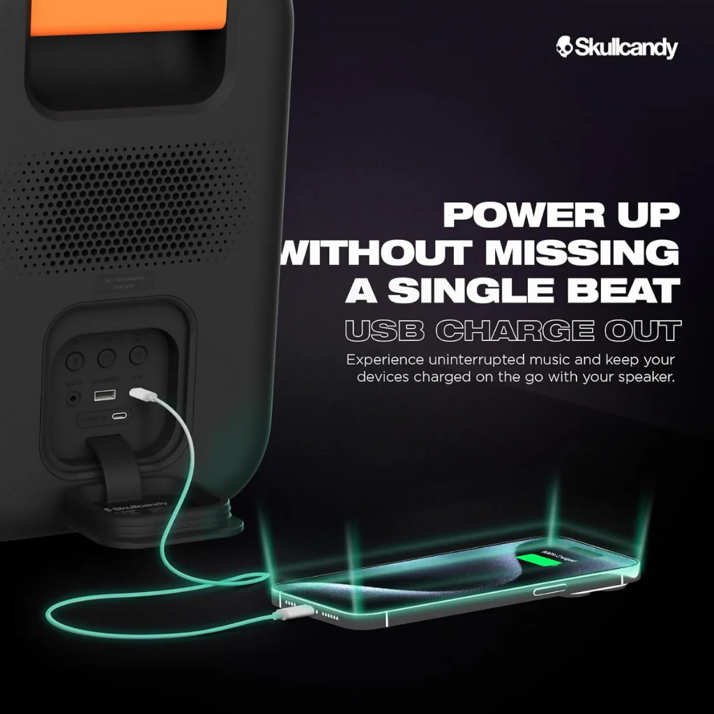 LA FIESTA PORTÁTIL. La mayoría de los altavoces portátiles te dejan con ganas de más. Stomp no. Este es un altavoz de frecuencia completa con agudos hermosos y brillantes, medios ricos y graves profundos y contundentes. Stomp tiene suficiente potencia para soportar una fiesta en casa por sí solo, pero agrega la comodidad de una portabilidad total, una construcción resistente al agua, la capacidad de conectarse a hasta 99 altavoces inalámbricos Skullcandy más y un espectáculo de luces LED.